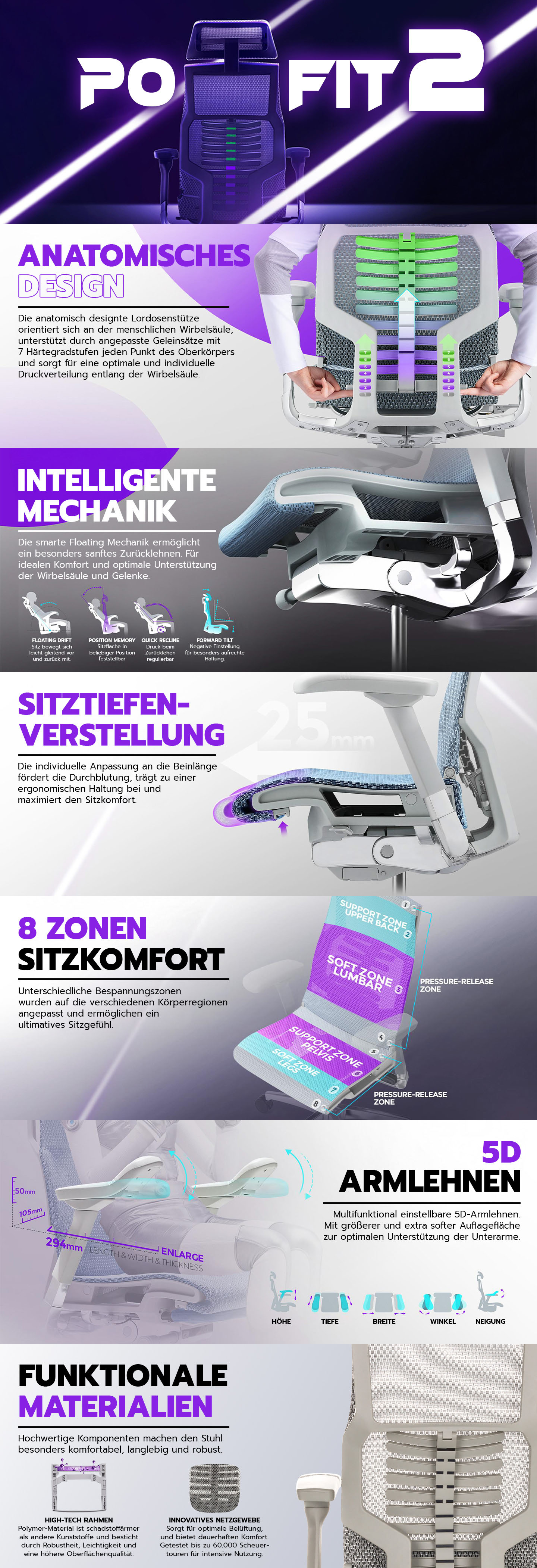 Mit futuristischem Design, modernster Technik und einer überragenden Praxistauglichkeit überzeugt der POFIT GEN2 auf ganzer Linie. Die anatomisch designte Lordosenstütze orientiert sich an der menschlichen Wirbelsäule, unterstützt durch angepasste Geleinsätze mit verschiedenen Härtegradstufen jeden Punkt des Oberkörpers und sorgt für eine optimale und individuelle Druckverteilung entlang der Wirbelsäule. Die flexibel konstruierte Kopfstütze, welche sich in Höhe und Neigung verstellen lässt erweitert zusätzlich den Sitzkomfort dieses Bürostuhls. Neben den vielen zusätzlichen Funktionen und dem unbeschreiblichen Sitzgefühl sorgt das außergewöhnliche Design für den einzigartigen Charakter. Als zukunftsorientierter und höchst ergonomischer Bürostuhl schafft der POFIT GEN2 optimale Voraussetzungen für Produktivität und inspirierte Arbeit.